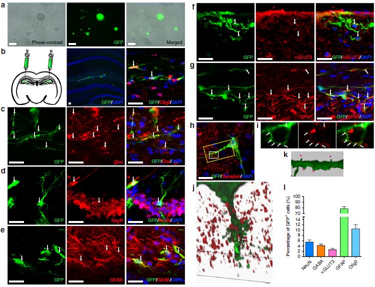 作者進(jìn)一步研究了ptf1a重編程hiNSC在體內分化成神經(jīng)和膠質(zhì)細胞系的潛力。將帶GFP標記的hiNSC移植到成年小鼠海馬區,發(fā)現ptf1a重編程的hiNSC在體外和體內都具有分化成神經(jīng)和膠質(zhì)細胞系的多能性。