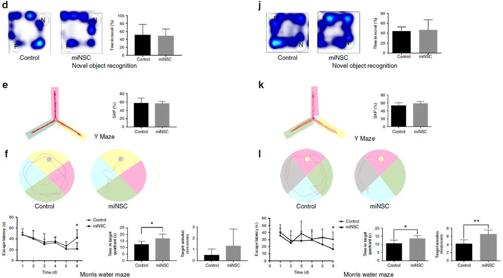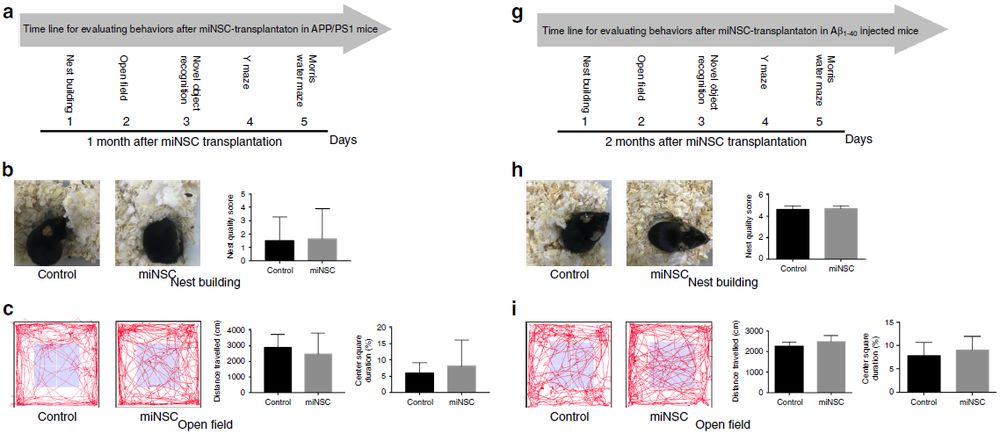 作者也評估了miNSC對β-淀粉樣蛋白1-40(Aβ1-40)損傷AD小鼠模型的治療潛力。首先確定了Aβ1-40損傷小鼠的學(xué)習和記憶障礙小鼠與AD類(lèi)似。將GFP標記的miNSC在注射Aβ1-40 2周后移植到相同位置。兩個(gè)月后,作者進(jìn)行了同樣的行為學(xué)試驗,發(fā)現移植miNSC可以顯著(zhù)提高APP / PS1和Aβ1-40損傷AD小鼠模型的空間學(xué)習和記憶能力,療效與ESC來(lái)源的NSC相似(圖6g-k)。