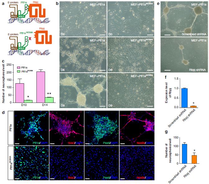 先前有研究表明,Ptf1a與Rbpj、E-蛋白以非Notch信號依賴(lài)性方式形成DNA結合三聚體,以特化胰腺細胞系和GABA能神經(jīng)元。作者研究了Ptf1a和Rbpj之間非Notch信號依賴(lài)性的互作是否也是Ptf1a重編程所需要的。在MEF中,WB和免疫共沉淀結果顯示,Rbpj蛋白是內源性表達,外源性表達的Ptf1a可以免疫共沉淀Rbpj。將Dox可誘導的 Ptf1aW298A(此突變體中Ptf1a與Rbpj的互作被破壞,但仍可與E-蛋白結合)慢病毒注射到MEF中,在注射6天后,沒(méi)有發(fā)生典型形態(tài)變化以形成細胞群落,只在9—14天產(chǎn)生了少數類(lèi)似正常形態(tài)神經(jīng)球的群落,而注射了野生型Ptf1a病毒的MEF則在在9—14天,在12孔板中每板產(chǎn)生了數以百計的神經(jīng)球(圖7 b,c)。類(lèi)似地,MEF感染Ptf1aW298A慢病毒后未能表達NSC標志蛋白質(zhì)Sox2、Pax6或Nestin(圖7 d)。因此,與Rbpj的互作是Ptf1a重編程的先決條件。與此一致的是,敲除MEF中Rbpj的表達后,ptf1a誘導的神經(jīng)球的數量減少了兩倍多(圖7e-g)。