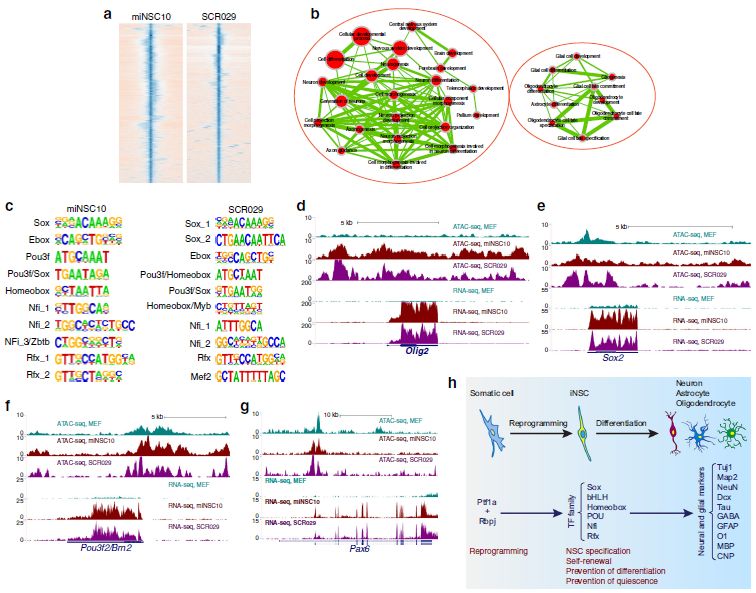 miNSC10 iNSC和SCR029 NSC的ATAC-seq結果表明,peak關(guān)聯(lián)基因富集在神經(jīng)發(fā)生、神經(jīng)元發(fā)育、大腦發(fā)育、膠質(zhì)細胞發(fā)育(圖8a, b),與NSC特征一致。在peak峰值中心300 bp窗口中鑒定新motif,說(shuō)明miNSC10和SCR029細胞都富集了類(lèi)似的屬于多個(gè)TF家族的TF結合motif,TF家族包括Sox、bHLH (Ebox)、Pou3f、homeobox、Nfi和Rfx(圖8c)。相應地,RNA-seq數據顯示,與MEF相比,這些TF基因家族的多個(gè)成員在miNSC10和SCR029細胞中上調或高表達。qRT-PCR證明,除了Sox2之外,Sox5、6、8、21在miNSC10和SCR029細胞中均表達上調。一般來(lái)說(shuō),miNSC10細胞的ATAC-seq圖譜與SCR029細胞相似,但與MEF完全不同;而對于上調的TF基因,如Olig2(bHLH)、Sox2、Pou3f2/Brn2、Pax6 (homeobox),與MEF相比,miNSC10和SCR029細胞中這些位點(diǎn)具有更多的峰和/或差異峰(圖8d-g),說(shuō)明更開(kāi)放的染色質(zhì)結構增加了基因表達。