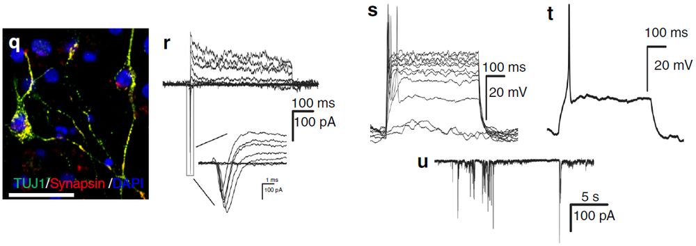 根據qRT-PCR結果,ptf1a重編程的hiNSC幾乎不表達多能性基因OCT4和NANOG。相反,它們高表達NSC標志蛋白,包括SOX2、PAX6、NESTIN、OLIG2和FABP7(圖9 e-i)。體外分化試驗表明hiNSC具有三能性(圖9p,j-n)因此,Ptf1a具有類(lèi)似的活性,可將人類(lèi)成纖維細胞重編程形成三能性NSC。作者通過(guò)突觸素染色標記試驗、電生理特性分析表明,ptf1a重編程的miNSC能夠分化為功能神經(jīng)元(圖9q,r-u)。