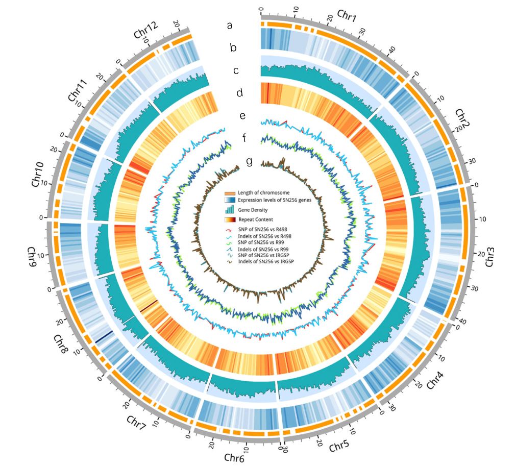 為了填補北方超級稻高質(zhì)量基因組序列的gaps,作者對SN265基因組進(jìn)行了de novo測序和組裝。利用P5-C3 SMRT測序,獲得24.94 Gb的原始數據,平均讀長(cháng)為9.6 kb,二代測序共獲得22.05 Gb的原始數據,組裝得到SN265的基因組,大小為364.45 Mb,contig N50 達到6.96 Mb,通過(guò)從頭預測、同源預測以及RNA-seq分析后共獲得37,609個(gè)基因(圖2)。對R99進(jìn)行低深度(30×)三代重測序和基因組組裝,獲得了R99389.6 Mb的基因組,contig N50也達到3.05 Mb(圖2)。