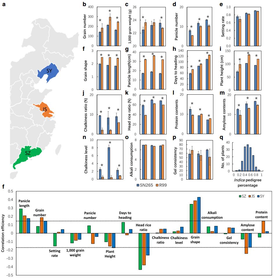 秈稻和粳稻為亞洲栽培水稻的兩個(gè)亞種,它們的地理分布以及形態(tài)學(xué)性狀差異明顯,揭示其農藝性狀背后的遺傳基礎對于水稻生產(chǎn)非常重要,然而,其遺傳背景、生態(tài)條件以及農藝性狀之間的關(guān)系尚不清楚。沈農265(SN265)是我國第一個(gè)商用的超級稻,它作為中國北方骨干親本引領(lǐng)著(zhù)育種方向。本研究利用二代和三代測序對北方粳型超級稻SN265和R99進(jìn)行測序,并獲取SN265高質(zhì)量基因組,又構建了RIL群體重測序遺傳連鎖圖譜,并對多個(gè)重要農藝性狀進(jìn)行了QTL分析。此外,還發(fā)現若干基因功能隨生態(tài)環(huán)境的變化而改變,并且許多等位基因對不同的遺傳背景呈現差異性的響應。