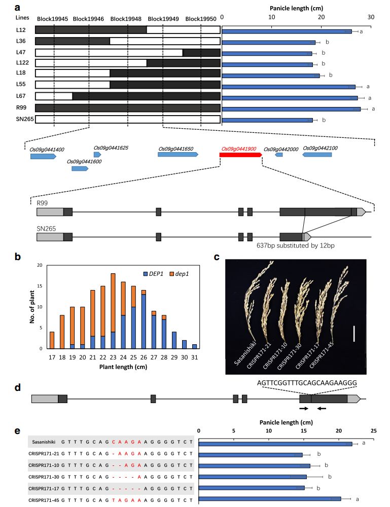 為了確定QTL簇的候選基因,進(jìn)一步做了基因的精細定位。首先,關(guān)注的是chr9上的 qPL9簇,候選基因被定位在43kb的區間內,其中包含7個(gè)注釋基因,通過(guò)序列比對分析發(fā)現一個(gè)候選基因DEP1上的exon5中存在堿基序列的替換,即R99中637bp的片斷在SN265中被替換成12bp的序列;接著(zhù)共分離分析發(fā)現SN265型的dep1具有明顯短于R99的穗長(cháng)(圖5)。為了證明DEP1是qPL9的候選基因,利用 CRISPR/Cas9技術(shù)對Sasanishiki品種中的DEP1基因誘變,獲得五個(gè)突變體株系,其中四個(gè)突變體發(fā)生移碼突變,呈現短穗長(cháng),另外一個(gè)突變體產(chǎn)生兩個(gè)氨基酸的替換,其穗長(cháng)與Sasanishiki無(wú)顯著(zhù)性差異(圖5),暗示DEP1是qPL9簇中控制穗長(cháng)的基因。