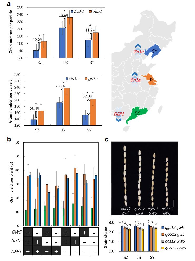 為了揭示生態(tài)環(huán)境與遺傳背景對基因功能的影響,首先,作者發(fā)現Gn1a對水稻單穗籽粒數目的貢獻主要集中在江蘇與沈陽(yáng)兩個(gè)實(shí)驗點(diǎn),而DEP1僅僅在深圳被檢測到是控制單穗籽粒數目的QTL(圖6)。對以上三個(gè)種植區,又進(jìn)一步比較攜帶有 DEP1/dep1與Gn1a/gn1a的不同水稻材料,結果發(fā)現在高緯度生態(tài)區dep1對單穗籽粒數目的貢獻減少,而gn1a對其貢獻明顯增強(圖6)。類(lèi)似地,DTH8、 SDG708與PHYB在江蘇均被檢測到,而PHYB在深圳也被檢測到,同樣, DTH8、 SDG708在沈陽(yáng)也被檢測到;結果顯示DTH8、SDG708幾乎不會(huì )影響在深圳的抽穗期,PHYB在沈陽(yáng)有較弱的作用(圖6)。概括起來(lái),Gn1a、 SDG708、SD1與GW5的功能在高緯度地區被增強,另一方面,PHYB與DEP1的功能隨著(zhù)緯度的北移被破壞,有趣的是,DTH8在中緯度地區具有較強的功能,緯度的南移或北移都會(huì )削弱其功能。