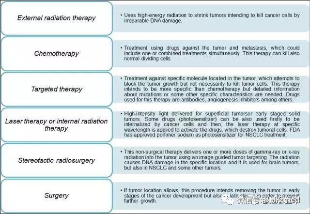 高強度射線(xiàn)照射表淺腫瘤或早期實(shí)體性腫瘤??墒紫葢媚承┧幬铮ㄈ绻饷魟?,使其進(jìn)入腫瘤細胞后再應用特定波長(cháng)的微波進(jìn)行激光治療、?激活這些藥物從而破壞腫瘤細胞。FDA已批準卟吩姆鈉(porfimer?sodium)用作NSCLC治療的光敏劑;