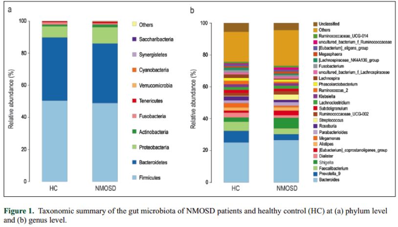 視神經(jīng)脊髓炎譜系疾病(NMOSD)是一種中樞神經(jīng)系統(CNS)的炎癥性自身免疫疾病,是視神經(jīng)和脊髓同時(shí)或相繼受累的急性或亞急性脫髓鞘病變。視神經(jīng)脊髓炎譜系疾病具有高復發(fā)和高致殘性,具有人種差異和性別差異(男女患病比例為1:10),通常與其他自身免疫疾?。ㄈ缦到y性紅斑狼瘡、橋本氏病等)共病。長(cháng)期以來(lái),NMOSD可通過(guò)免疫學(xué)標記(如水通道蛋白-4抗體,AQP4-IgG)或遺傳基因標記(如人類(lèi)白細胞抗原,HLA)鑒定,與幽門(mén)螺桿菌等病原相關(guān)的抗體在NMOSD患者的腸胃中也被普遍發(fā)現。NMOSD患者腸道微生物的研究目前仍較少,本文采用高通量測序(NGS)和氣相色譜(GC)技術(shù),分析了NMOSD患者的腸道微生物與短鏈脂肪酸(SCFAs)變化情況。