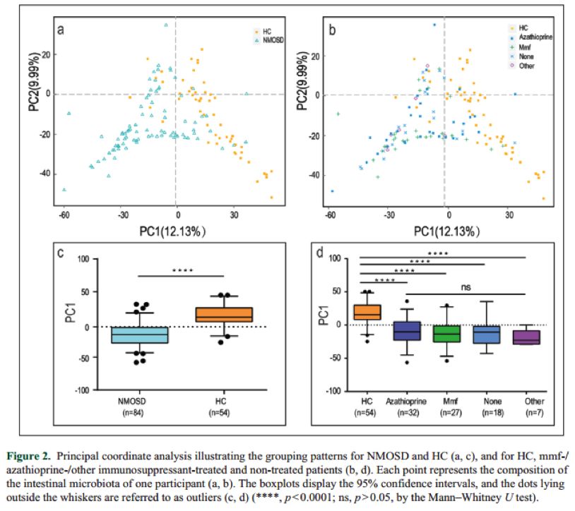 樣品來(lái)源:84名中國NMOSD患者(AQP4-IgG血清反應呈陽(yáng)性),54名健康人群(HCs);84名NMOSD患者中,66名使用免疫抑制劑(27名使用霉酚酸酯mmf,32名使用硫銼嘌呤azathioprine,7名服用環(huán)流酰胺、甲氨蝶呤或利妥昔單抗),18名NMOSD患者不做治療。