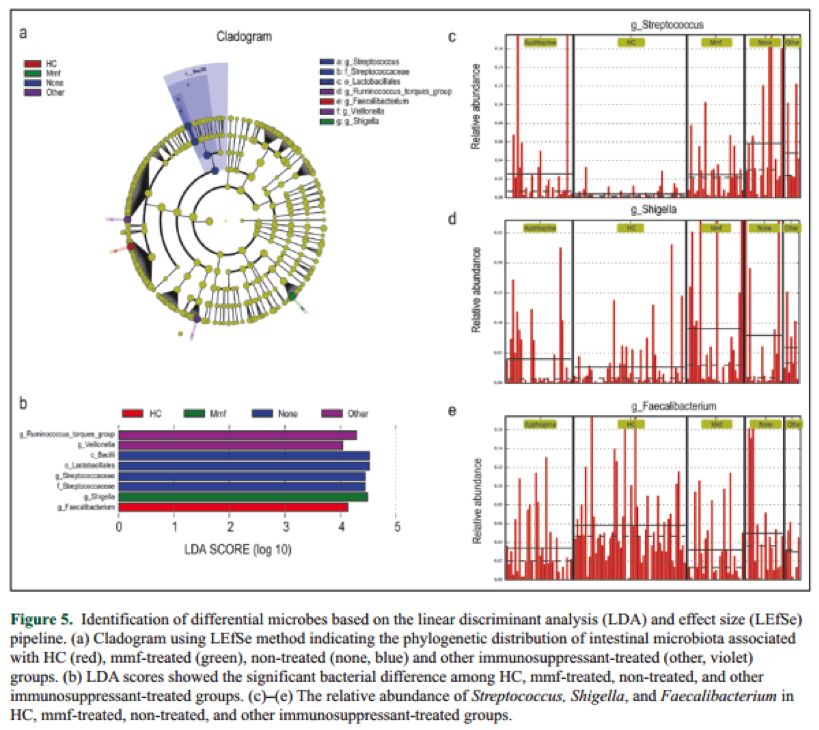 免疫抑制治療比較發(fā)現,鏈球菌屬(Streptococcus)、志賀氏菌屬(Shigella)主要集中于NMOSD人群,糞球菌屬(Faecalibacterium)在HC人群中最豐富。與非治療組相比,NMOSDs人群的鏈球菌屬(Streptococcus)在使用mmf、azathioprine后略有降低(圖 5c),但在HC人群中更低。與非治療相比,NMOSDs人群的免疫抑制治療劑(mmf、azathioprine & others)治療對志賀氏菌屬(Shigella)的抑制作用不明顯(圖 5d)。雖然,HC人群比非治療NMOSDs人群的糞球菌屬(Faecalibacterium)略高,然而,免疫抑制治療劑(mmf、azathioprine)使糞球菌屬(Faecalibacterium)反而顯著(zhù)降低(圖 5e)。