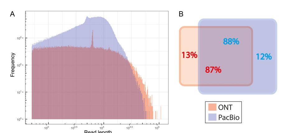 相比于 PacBio,MinIon 能產(chǎn)出更長(cháng)的序列,但是 PacBio 測到的序列數量是 MinIon 的 5.6 倍左右。大部分的序列在兩個(gè)平臺都能檢測到,個(gè)別特有的序列可能和實(shí)驗階段的片段篩選有關(guān)。