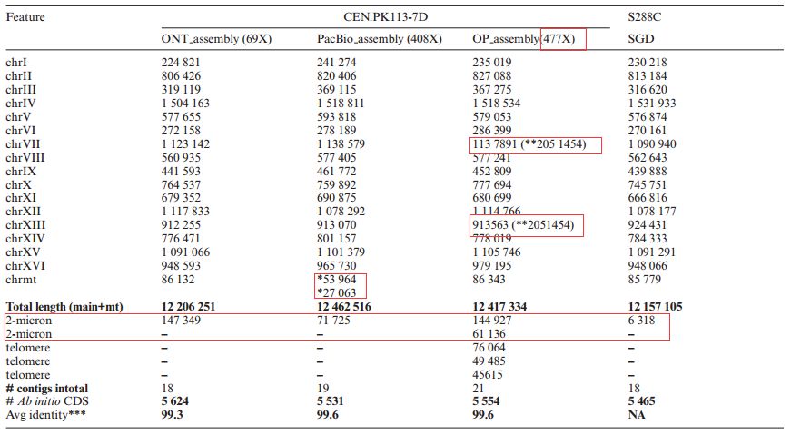 對于不同測序平臺得到的基因組數據,采用 3 種組裝方式:只用 MinIon 得到的數據進(jìn)行 de nove組裝得到 ONT_assembly;只用 PacBio 得到的數據進(jìn)行 組裝得到 PacBio_assembly;用 MinIon和 PacBio 得到的數據共同進(jìn)行 de nove 組裝得到 OP_assembly。然后使用 Illumina 的數據對組裝結 果進(jìn)行校正。三種組裝方式得到的 2μm 質(zhì)粒都比已知的 S288C 酵母的 2μm 質(zhì)粒更長(cháng),而ONT_assembly 的組裝結果很好,剛好組裝出 16 條染色體,1個(gè)線(xiàn)粒體序列,1個(gè)質(zhì)粒序列;PacBio_assembly 組裝的線(xiàn)粒體序列是斷裂開(kāi)的兩段;OP_assembly 組裝出的 contigs 最多,多出 3個(gè)端粒 DNA 片段,2 個(gè)質(zhì)粒片段,而且組裝時(shí)把 VII 染色體和 XIII 染色體的端粒區域連接在了一 起。 總體來(lái)看,三種組裝方式得到的基因組很相近,由于 OP_assembly 的測序深度最高,與 S288C酵母的平均比對率達到了 99.6%。