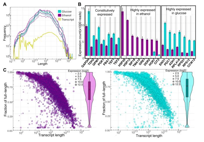 分別對葡萄糖條件和乙醇條件下生長(cháng)的酵母進(jìn)行全長(cháng)轉錄組測序,葡萄糖生長(cháng)條件下的酵母 共計獲得~509 MB(59X)數據量,包含約 530,000 高質(zhì)量 reads,其中 N50 為 1150bp;乙醇條 件下的酵母共計獲得~623 MB(72X)數據,約 623000 高質(zhì)量 reads,其中 N50 為 1263 bp。該 技術(shù)的比對率為 88%,錯誤率為 12%,其中超過(guò) 70%的轉錄本為全長(cháng)轉錄本,鑒定長(cháng)度最長(cháng)轉錄 本超過(guò) 5kb。全長(cháng)轉錄本的比例隨著(zhù)轉錄本長(cháng)度增加而減小,與轉錄本的表達量沒(méi)有明顯關(guān)系。有22 個(gè)轉錄本是明顯高表達的,比如 豐度最高的轉錄本之一, 的同源 基因,在兩個(gè)培養條件下表達量都很高;在乙醇條件下特異高表達一些與熱休克蛋白、氧化脅迫 相關(guān)的基因,其中 編碼檸檬酸合酶,說(shuō)明此時(shí)激活了乙醛酸途徑;在葡萄糖培養條件下,與 有氧呼吸、核糖體相關(guān)的基因表達量較高,符合此條件下酵母生長(cháng)更快的特征。