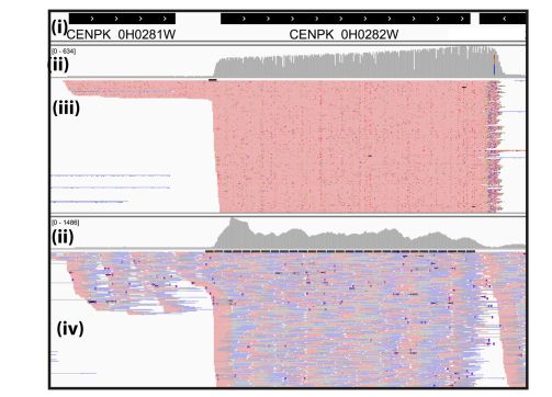 MinION 的數據中,我們發(fā)現相鄰的 2 個(gè)基因 PTH1 (CENPK0H0281W) 和 ERG9 (CENPK0H0282W) 轉錄在一個(gè)轉錄本中,有大量的 reads 跨越了基因間區。而 Illumina 的比對結果中, 在兩個(gè) ORFs 之間的區域,比對到的 reads 不是完全覆蓋的,這種低置信度的信息很可能被忽略。