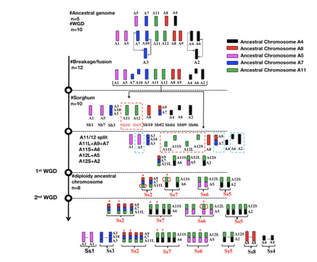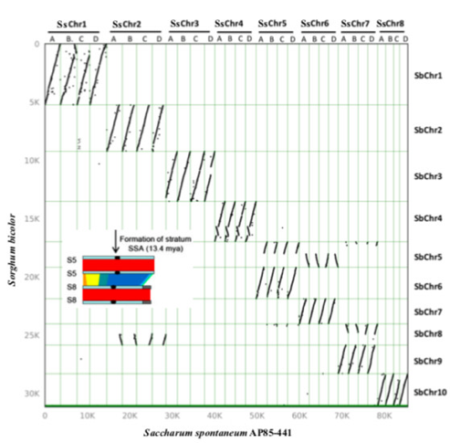 AP85-441基因組的組裝顯示了S.spontaneum的染色體數目從10降到8,而這與頻繁復制的古復制染色體對相關(guān),通過(guò)與高粱的聚類(lèi)比對,發(fā)現高粱祖先5染色體和8號染色體同源物經(jīng)歷了染色體裂變(圖2)。SbChr05(A12)的祖先染色體斷裂分為兩個(gè)主要部分,即C5S(A12S)和C5L(A12L),分別轉移到SbChr06(A2)和SbChr07(A5)的祖先染色體;SbChr8(A11)的祖先染色體斷裂為兩個(gè)主要的部分,即C8S(A11S)和C8L(A11L),分別轉移到SbChr09(A6)和SbChr02(A7+ A9)的祖先染色體中。SbChr8和SsChr5之間及SbChr5和SsChr7之間近乎同源的短片段是在高粱與甘蔗分化前,高粱SSA形成于13.4MYA同源基因的殘留物,同時(shí)發(fā)現,S5中較小的SSA區域和S8中SSA的較大區域在重排的AP85-441基因組中也是保守的。