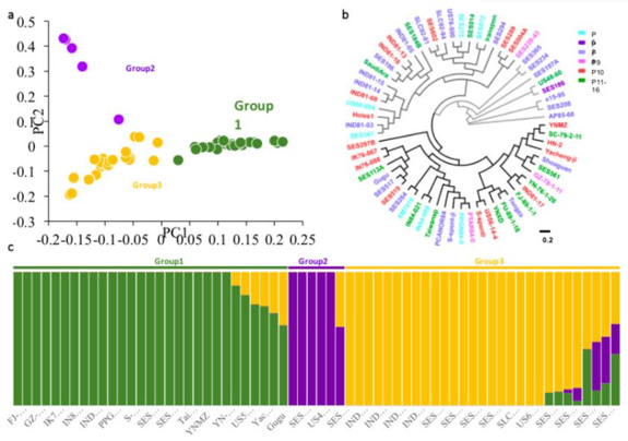 通過(guò)對64份甘蔗(Saccharum spontaneum)群體材料遺傳多樣性研究,發(fā)現其具有廣泛的自然部分范圍,遍及亞洲,印度次大陸,地中海和非洲,且自然種群具有廣泛的表型,遺傳和倍性水平多樣性(圖4)。研究發(fā)現,與高粱相比具有大規模染色體重排的S. spontaneum區域具有比非重排區域更高的遺傳多樣性,并且可能經(jīng)歷了更強的平衡選擇。雖然幾條單獨的染色體沒(méi)有顯示出顯著(zhù)差異,但是比較所有染色體上的平均值顯示重排區域中的核苷酸多樣性(0.00025±0.00003)遠高于非重排區域中的核苷酸多樣性(0.00021±0.00001),染色體重排區域的Tajima’s D(-0.659±0.052)遠遠高于非重排區(-0.720±0.011),重排區的SNP密度(360.27±48.41) 高于非重排區域(297.46±12.65, P=0.001798);此外,GO富集顯示,染色體非重排區主要富集到與基本生命周期,光合作用,呼吸作用和ATP合成的通路上。重排區主要富集在GO生物合成和代謝,跨膜轉運和離子結合通路上。