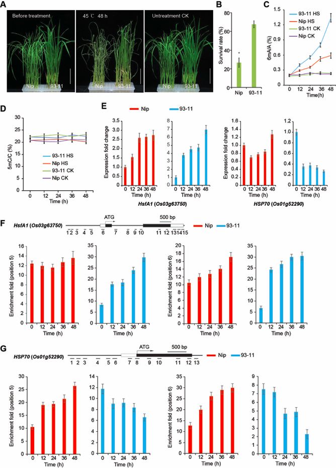 根據SMRT測序結果,篩選出候選的6mA修飾的熱脅迫相關(guān)基因,如熱休克轉錄因子A1(HsfA1)和熱休克蛋白70(HSP70)。HSFA1是熱脅迫反應的主要轉錄調控因子,其在非脅迫條件下受到HSP70的抑制。HSFA1功能缺失導致熱脅迫敏感表型。HsfA1和HSP70表達的變化與其6mA水平的變化呈正相關(guān),這可能是Nip和93-11之間熱脅迫耐受性差異的原因。
