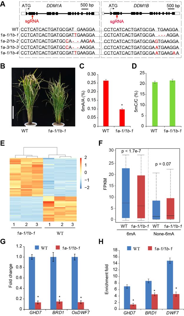 水稻基因組含有兩個(gè)DDM1同源基因DDM1a和DDM1b,由于功能冗余,只有T-DNA插入單突變體產(chǎn)生的雙突變體DDM1a/1b表現出發(fā)育表型。然而,DDM1a/1b不產(chǎn)生活花粉,導致種子呈空殼和深色。用CRISPR-Cas9對Nip背景中的DDM1a和DDM1b進(jìn)行了有針對性的誘變,并鑒定了10個(gè)獨立的T1系用于DDM1a、DDM1b單突變和4個(gè)獨立的DDM1a/DDM1b(1a/1b)雙突變型。在任何不同類(lèi)型的DDM1a或DDM1b純合子單突變體中均未觀(guān)察到表型。與野生型植物相比,所有純合1a/1b系表現出相同的矮化表型。1a-1/1b-1顯示出降低的結實(shí)率,而另外3個(gè)雙突變體顯示不育。LC-MS/MS對DNA甲基化水平的定量測量顯示6mA水平顯著(zhù)降低,但1a/1b植物中5mC水平變化不大。6mA-IPqPCR分析顯示,6mA水平在大多數隨機選擇的位點(diǎn)中顯著(zhù)降低。RNA-seq結果表明野生型中6mA修飾基因的表達水平顯著(zhù)高于1a-1/1b-1植物中的相同基因,野生型中非6mA基因與1a-1/1b-1植物中的相應基因之間沒(méi)有表達水平差異。結果表明6mA水平與基因表達呈正相關(guān)。