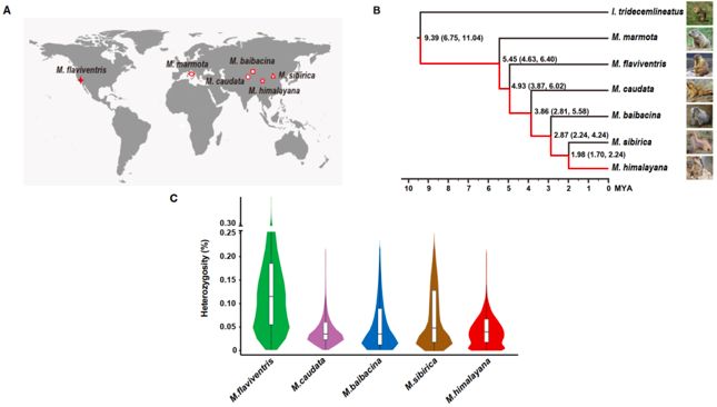 圖2、旱獺的地理位置,系統發(fā)育關(guān)系和雜合度分析