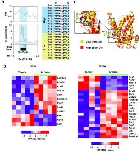 為了更好地了解喜馬拉雅旱獺的高原適應性機制,研究人員從極高海拔(海拔> 4,500 m,n = 10)和相對低海拔(<1,900 m,n = 10)收集了20只喜馬拉雅旱獺。研究人員首先測量了血液參數,發(fā)現與低海拔喜馬拉雅旱獺相比,高海拔喜馬拉雅旱獺的一些血液相關(guān)性狀,尤其是紅細胞計數,血紅蛋白濃度和平均紅細胞體積顯著(zhù)增加。接下來(lái),對每個(gè)喜馬拉雅旱獺進(jìn)行了全基因組測序,并在喜馬拉雅旱獺基因組中搜索了具有高種群分化(Fst)和多樣性比率(qp,low/qp, high)的區域,最終鑒定了分布在喜馬拉雅土撥鼠基因組不同scaffolds?中的24.84 Mb受選擇的區域。這些區域含有383個(gè)功能基因,與非選擇性基因相比,這些基因具有更高的Ka / Ks值(P <0.01),主要功能類(lèi)別包括“缺氧反應”,“DNA修復”,“血管生成”,“心臟功能”,“脂肪酸代謝”,“細胞周期”,“發(fā)熱”和“鈣信號通路”。參與缺氧誘導因子-1(HIF-1),血管內皮生長(cháng)因子(VEGF)或其它缺氧相關(guān)信號通路的10個(gè)功能基因,包括Slc25a14,Nox-1,Hmox1,Vegfr2,Atg16l2,Bex1,Ptgr2,Gprasp1,Fam46d?和Chd3,在高海拔和低海拔群體之間顯示出明顯的基因分型差異(圖4 A)。在Slc25a14中發(fā)現了非同義替換(由Ser28取代Phe28,F28S),其顯示出*強的分化信號(FST = 0.73)(圖4 A和B)?;谕唇5腟lc25a14的三維結構顯示,F28S替換發(fā)生在N末端的loop區域,并且由于氨基的電荷和極性的變化而增加其與相鄰的α-螺旋的距離(圖4 C)。為了進(jìn)一步評估這一變體的功能影響,研究人員將突變體Slc25a14與其在不同哺乳動(dòng)物中的直系同源基因進(jìn)行比對,并發(fā)現Phe28在比對的其它動(dòng)物中高度保守。該突變體功能影響的預測證明F28S取代是有害的,所有這些結果都表明F28S突變可能是高海拔群體Slc25a14選擇性清除的結果。為了推測旱獺高海拔適應和冬眠的遺傳適應性機制,研究人員在選擇性清除區域鑒定到了116個(gè)差異表達基因,在這些基因中,25個(gè)差異表達基因與HIF-1途徑相關(guān),主要屬于DNA修復,血管生成,脂肪酸代謝,細胞凋亡/細胞周期和發(fā)熱的類(lèi)別相關(guān)。在冬眠/覺(jué)醒周期中,大量選擇性清除基因具有差異表達,表明這兩種生物學(xué)過(guò)程之間存在共同的遺傳影響(圖4 D)。在這些基因中,Bex1, Apln, kcne1l, Med12, Dad1和Fgf16在冬眠階段肝臟或腦中顯著(zhù)上調(圖4 D),進(jìn)一步證明這些基因參與冬眠和高原適應性,先前的研究報道了這些基因參與許多生理過(guò)程,包括神經(jīng)元分化,肝再生,血管生成和能量代謝,而這需要進(jìn)一步的實(shí)驗驗證。