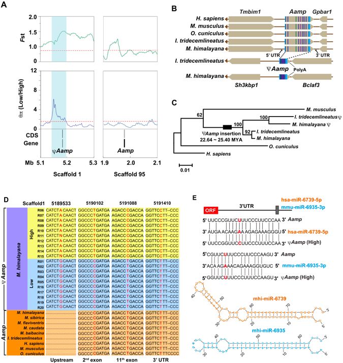 假基因逐漸被認定為是適應性表型多樣化的重要調節因子,與選擇性清除信號相關(guān),研究人員鑒定了27個(gè)參與極高海拔適應的候選假基因,占全基因組范圍內假基因的1.83%。這一比率幾乎與具有1.78%的功能基因的比率相當,表明它們在極端環(huán)境的適應性中的作用不可忽略。與蛋白質(zhì)編碼基因中發(fā)現的群體基因型差異一致,研究人員在高海拔群體中觀(guān)察到受選擇的假基因中幾乎固定的突變,例如ΨAamp,ΨAdl1和ΨRnf114。在這些假基因中,血管相關(guān)的遷移細胞蛋白假基因(ΨAamp)具有完整的基因結構并顯示出*高的Fst值(Fst = 0.67),但ΨAamp未被檢測為受選擇性基因(圖4 A和5 A)。ΨAamp的結構顯示它是一個(gè)整合的加工假基因,其mRNA通過(guò)逆轉錄被插入基因組中(圖5 B)。這個(gè)假基因含有過(guò)早終止密碼子(第208個(gè)核苷酸,C> T),缺失/插入和移碼突變,使其不能翻譯成功能性的蛋白,Aamp和ΨAamp的共線(xiàn)性分析表明在不同哺乳動(dòng)物中Aamp是高度保守的。然而,在地松鼠和喜馬拉雅旱獺中發(fā)現并保存了高度保守的共線(xiàn)性位點(diǎn)(圖5 B),進(jìn)一步的系統發(fā)育分析表明,ΨAamp和Aamp屬于兩個(gè)獨立的分支,基于序列分歧插入時(shí)間的估算暗示假基因的插入事件發(fā)生在約22.64~25.40 MYA,在喜馬拉雅旱獺和地松鼠分化之前(圖?5 C)。這些發(fā)現支持古老的假基因對于松鼠具有特異性并從共同的祖先遺傳而來(lái)這一假設,然而,與地松鼠相比,喜馬拉雅旱獺顯示Aamp和ΨAamp之間的序列距離較小,這表明存在選擇性壓力來(lái)維持旱獺的遺傳元素。