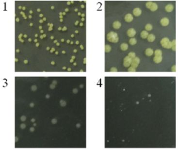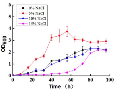 隨著(zhù)鹽濃度的增高,菌落顏色由黃色變?yōu)榘咨?,且?%的NaCl鹽溶液中生長(cháng)最佳,鹽濃度高于或低于該濃度,其生長(cháng)速度均會(huì )下降。