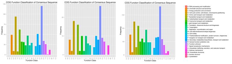 圖2、三個(gè)比較組的(5%/0%, 10%/0%和15%/0%)COG注釋