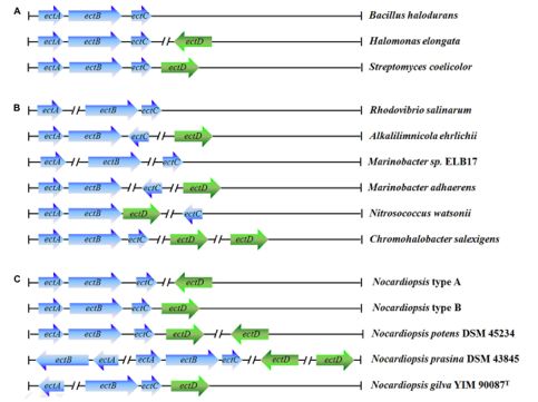 對四氫嘧啶和羥基四氫嘧啶合成基因ectABCD進(jìn)行種屬分析。其中在18個(gè)擬諾卡氏菌系中存在2個(gè)常見(jiàn)的ectABCD基因簇類(lèi)型。ectABC屬于一個(gè)基因簇,而ectD則位于基因組的其他位置(type A, 15 strains),又或者ectABCD歸屬于相同的基因簇(type B, 3 strains)。此外,在N. potens?DSM 45234和N.prasina?DSM 43845菌系中發(fā)現至少一個(gè)ectABectD基因。然而,在N.gilva?YIM 90087T中,基因簇類(lèi)型卻與其他菌系顯著(zhù)不同。ectA基因完全與ectBCD基因簇分開(kāi),且ehuABCD(四氫嘧啶和羥基四氫嘧啶ABC轉運受體基因)位于ectD基因的下游。