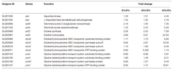 對菌種進(jìn)行二代測序,篩選FDR<0.01,Fold Change≥2的基因為差異表達基因,并使用COG、GO、KEGG、Swissport和NR數據庫進(jìn)行注釋分析。通過(guò)COG分類(lèi),共獲得25個(gè)COG組別,其中氨基酸轉運和代謝、碳水化合物轉運和代謝是其主要組分。DEGs被分布在34個(gè)GO term里,其中包括細胞組分、分子功能和生物過(guò)程三大類(lèi)。與此同時(shí),三個(gè)比較組(5%/0%, 10%/0%和15%/0%)差異表達基因分別富集到77、32和90條KEGG通路中,其中ABC轉運受體,甘氨酸、絲氨酸和蘇氨酸代謝在鹽刺激下扮演相當重要的角色。尤其在最大耐受度的NaCl鹽環(huán)境里,參與ABC轉運受體通路的四氫嘧啶和羥基四氫嘧啶基因、甜菜堿基因和四氫嘧啶和羥基四氫嘧啶合成基因表達量都顯著(zhù)提高。