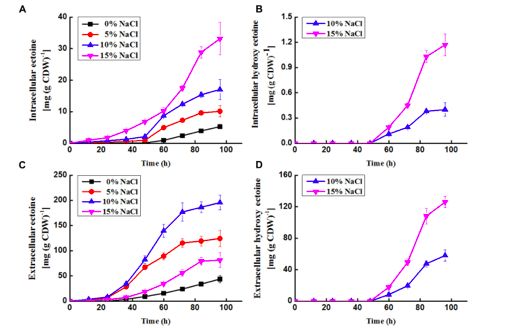 使用HPLC對四氫嘧啶和羥基四氫嘧啶含量進(jìn)行檢測,結果發(fā)現,胞內這兩種物質(zhì)的含量變化會(huì )隨著(zhù)時(shí)間累積,且積累程度隨著(zhù)NaCl濃度的升高而增加。值得注意的是,羥基四氫嘧啶在0或5% NaCl濃度下很難被合成;而48h后,在10%和15%的NaCl培養基中被檢測到。此外,這兩種物質(zhì)含量均會(huì )隨著(zhù)培養時(shí)間的增長(cháng)而增加。96h后,在15%的NaCl濃度培養下,四氫嘧啶(33.14 mg/g CDW)和羥基四氫嘧啶(1.17 mg/g CDW)達到最高水平。在10%和15%的鹽濃度環(huán)境下,四氫嘧啶的含量要比羥基四氫嘧啶的含量分別高42.6和28.3倍。這些結果表明,四氫嘧啶會(huì )在N. gilvaYIM 90087T的胞內累積。
