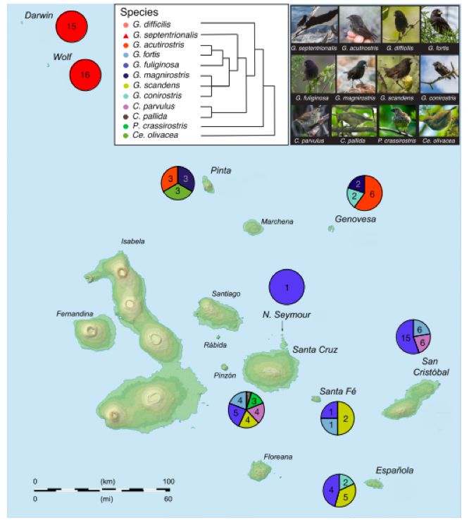 餅狀圖:不同島嶼上每種達爾文雀糞便樣本的數量;系統發(fā)育樹(shù)狀圖:目標達爾文雀的進(jìn)化關(guān)系。
