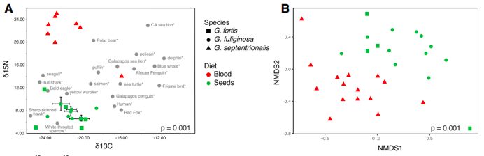 嗜血達爾文雀:以鰹鳥(niǎo)(一種熱帶海鳥(niǎo))血液和卵為食,而鰹鳥(niǎo)以魚(yú)類(lèi)為食,因此嗜血達爾文雀與海洋肉食動(dòng)物δ15N結果相似,而其他島上的達爾文雀以種子和昆蟲(chóng)為主。δ15N結果顯示:嗜血達爾文雀與G. fortisG.fuliginosa食性差異顯著(zhù)(p<0.0001),但與海洋食肉動(dòng)物(北極熊、海獅)更近(圖. 3A)。NMDS結果顯示:嗜血達爾文雀腸道微生物結構明顯區別于G.fortis和G.?fuliginosa(圖. 3B)。