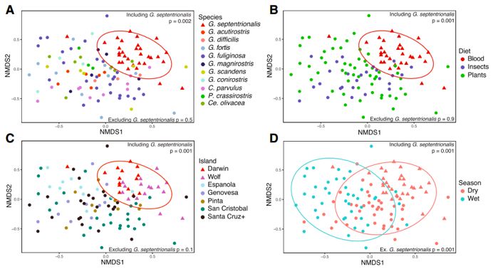 采樣:9個(gè)地緣隔離島,12種達爾文雀,114個(gè)糞便樣本,2個(gè)季度(旱季+雨季)。