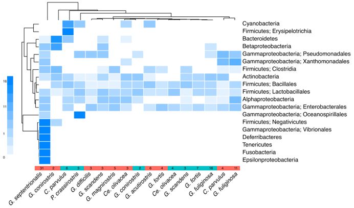 圖5.?聚類(lèi)熱圖:不同季度(旱、雨)和不同種類(lèi)(12種)的達爾文雀腸道微生物結構。