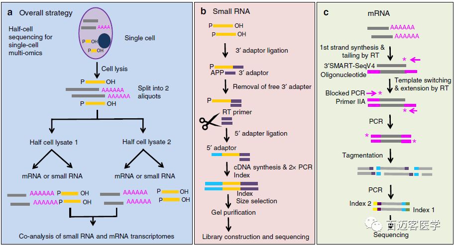 a 基于半細胞的單細胞miRNA-mRNA共測序的實(shí)驗流程; b 單獨的scmiRNA-seq流程;c 單獨的scRNA-seq流程