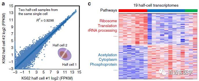 1、作者首先分別比較了來(lái)自同一細胞的半細胞單細胞microRNA測序和單細胞轉錄組測序之間的差異:該方法表現出良好的穩健性(~95%成功率)和重現性(microRNA和mRNA的R2=0.93),產(chǎn)生可獨立驗證的成對半細胞microRNA和mRNA表達譜。