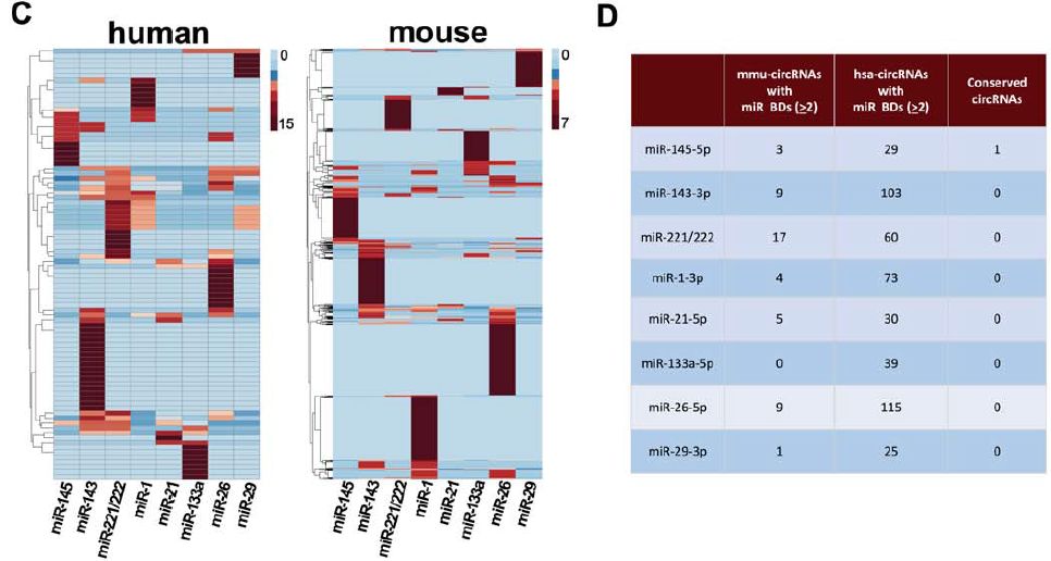 對于之前在VSMC具有重要生物學(xué)作用的miRNA,至少包含其中2個(gè)miRNA的保守結合位點(diǎn):只有一個(gè)circRNA具有miR-145-5p結合位點(diǎn),在小鼠和人之間是保守的。(小鼠中已被命名為circ_1529,人類(lèi)中命名為circ_8932,其來(lái)源基因為L(cháng)rp6,其至少具有7個(gè)miR-145-5p結合位點(diǎn))