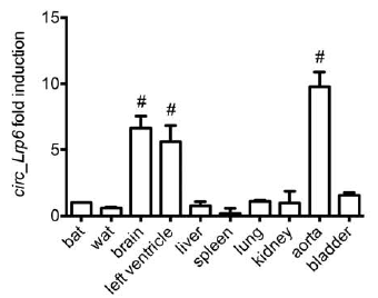 divergent primer擴增cDNA和gDNA,驗證其來(lái)源于可變剪接;RNAse R抗性檢測;放線(xiàn)菌素D處理抑制轉錄證實(shí)circRNA的穩定性(更長(cháng)的turn-over時(shí)間);qRT-PCR檢測各組織中circ_Lrp6表達水平并結合RNA-seq數據進(jìn)行分析:circ_Lrp6和Lrp6在血管中富集。
