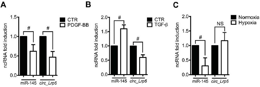 血小板衍生生長(cháng)因子(PDGF-BB)和轉化生長(cháng)因子(TGF-β)分別處理VSMC,在TGF-β處理的細胞中circ_Lrp6和miR-145表達之間存在負相關(guān)。