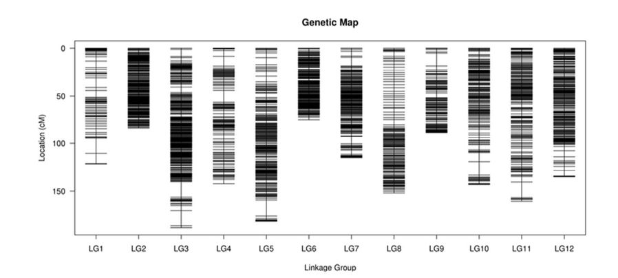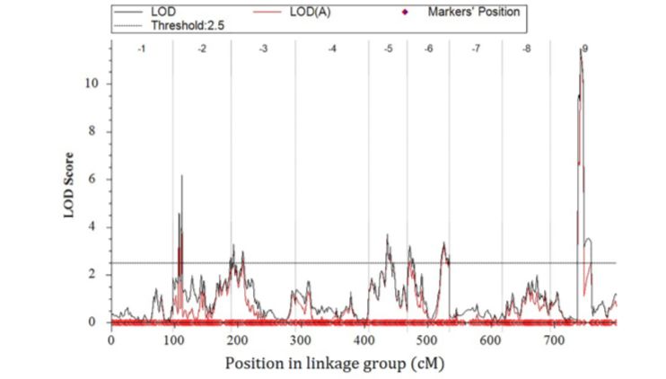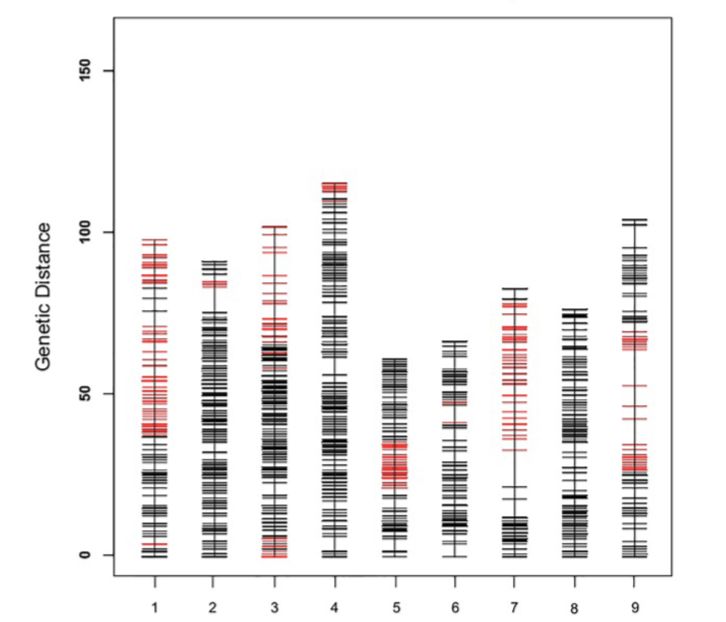 開(kāi)發(fā)了185,349個(gè)SLAF標記,其中,20,250個(gè)SLAF標記可以成功分型,最終上圖的標記為4787個(gè),分布于9個(gè)LG中,構建一張平均圖距為0.22cM的遺傳圖譜(如下圖),標記間最大gap超過(guò)10cM,這可能是由于小孢子培養構建DH群體的過(guò)程中,可能某種基因型更容易形成胚胎和再生植株,從而產(chǎn)生偏分離或某段染色體區域中無(wú)個(gè)體發(fā)生重組。