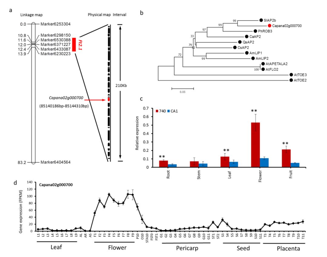 花期相關(guān)基因:針對主效QTL——Ft2.1進(jìn)行重點(diǎn)分析,它處于遺傳圖譜上的區間為0.763cM,對應的Zunla-1基因組上物理區間為210Kb,包含25個(gè)基因,其中存在之前鑒定到的Capana02g000700基因,編碼花器官同源異型蛋白。進(jìn)化分析表明Capana02g000700的同源基因,金魚(yú)草LIP1和LIP2、擬南芥APETALA2和辣椒CaAP2,均在花器官發(fā)育階段存在重要作用。同時(shí),比對雙親間序列差異,發(fā)現8個(gè)SNP標記和1個(gè)6bp的InDel標記,這導致親本CA1存在2個(gè)氨基酸的缺失和5個(gè)氨基酸的改變。繼DNA層面分析之后,RNA層面的分析qRT-PCR和RNA-seq表明,這個(gè)基因在雙親間存在差異表達,且在花器官中表達量最高,最終認為Capana02g000700就是控制花期的候選基因。