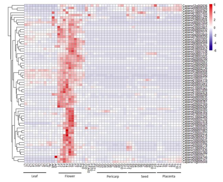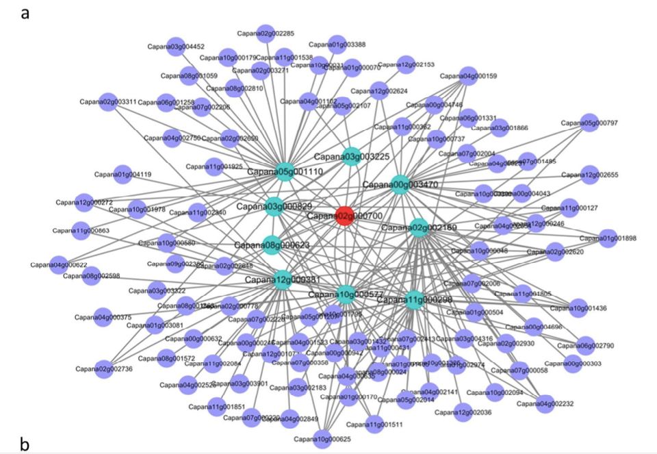 利用之前研究的不同發(fā)育階段和不同組織部的WGCNA分析結果,找到了花器官發(fā)育特定模塊,其中包含107個(gè)基因。這些基因中10個(gè)為T(mén)Fs,其中就包含已鑒定的Capana02g000700,這表明這些TFs可能與花發(fā)育的轉錄調控相關(guān)。這107個(gè)基因中,發(fā)現9個(gè)基因與Capana02g000700高度共表達,分為3個(gè)家族,且其功能均與花發(fā)育相關(guān)。上述,均表明Capana02g000700通過(guò)抑制靶基因和/或TF表達來(lái)控制花器官發(fā)育,進(jìn)而影響花期。