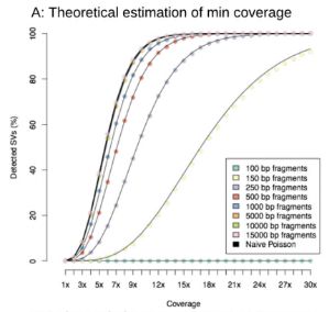 根據兩個(gè)人類(lèi)數據集的錯誤情況和read長(cháng)度,作者對兩條人的染色體模擬了50X?Pacbio?和ONT?read 。純粹的統計分析發(fā)現,近10X覆蓋度的數據(平均長(cháng)度10kb)就足夠去推斷所有SV斷點(diǎn)(一瞬間覺(jué)得自己可以省好多錢(qián)有木有),然而對于100bp的短read雙端測序至少要25X覆蓋度。當前這個(gè)統計只是一個(gè)理想情況,比如缺乏了重復和覆蓋度的偏移,因此是低估了所需的覆蓋度的。