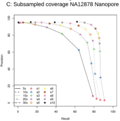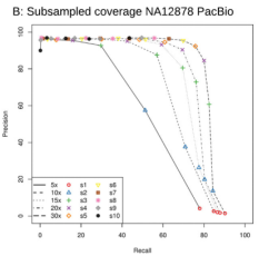 理想很豐滿(mǎn)、現實(shí)很骨感!理想情況下用10x覆蓋度測三代read就能檢測出來(lái)所有的結構變異,但是現實(shí)肯定不夠啦~ 作者對真實(shí)的Pacbio 55X數據,和Nanopore 28X數據所檢測到的SV和低深度下所檢測的SV進(jìn)行比較。對于Pacbio數據,15X的時(shí)候對于NA12878和SKBR3樣品的SV能識別到69.64%和67.24%,如果提升到30X時(shí),可分別識別到80.05%和76.63%。SKBR3的識別率相對較低主要因為它是癌癥樣品,有些極端的拷貝擴增。所以癌癥樣品要想識別到更多更準的SV,需要適當提升測序深度。