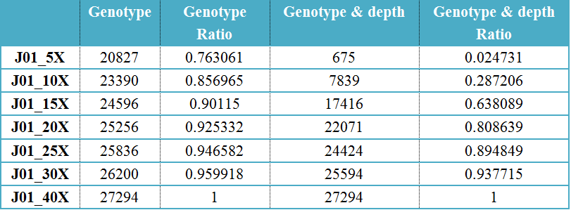 注:Genotype列代表不同深度下識別出的和40X SV基因型相同的SV個(gè)數,Genotype ratio為SV占40X SV的比例。?Genotype & depth 為與40X SV基因型相同且read支持數大于10的SV個(gè)數,Genotype & depth Ratio為基因型相同且read支持數大于10的SV比例。