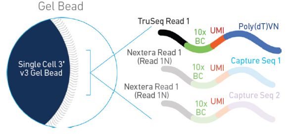 1)將制備好的單細胞懸浮液與含有barcode信息的凝膠珠以及酶的混合物結合,然后在微流體“雙十字”中進(jìn)行液滴包裹,從而形成GEMs(Gel Bead-In-EMulsions),有效GEMs中包含膠珠(膠珠中有預制的10x引物)、單細胞、和Master Mix。然后,在GEMs內進(jìn)行細胞裂解和逆轉錄反應。有效GEMs中,10X Barcode將與cDNA產(chǎn)物連接在一起,接下來(lái)再將GEMs破碎并打碎油滴,以cDNA為模板進(jìn)行PCR擴增,cDNA擴增完成以后,針對擴增產(chǎn)物進(jìn)行質(zhì)檢(擴增片段大小以及擴增產(chǎn)物的產(chǎn)量)。