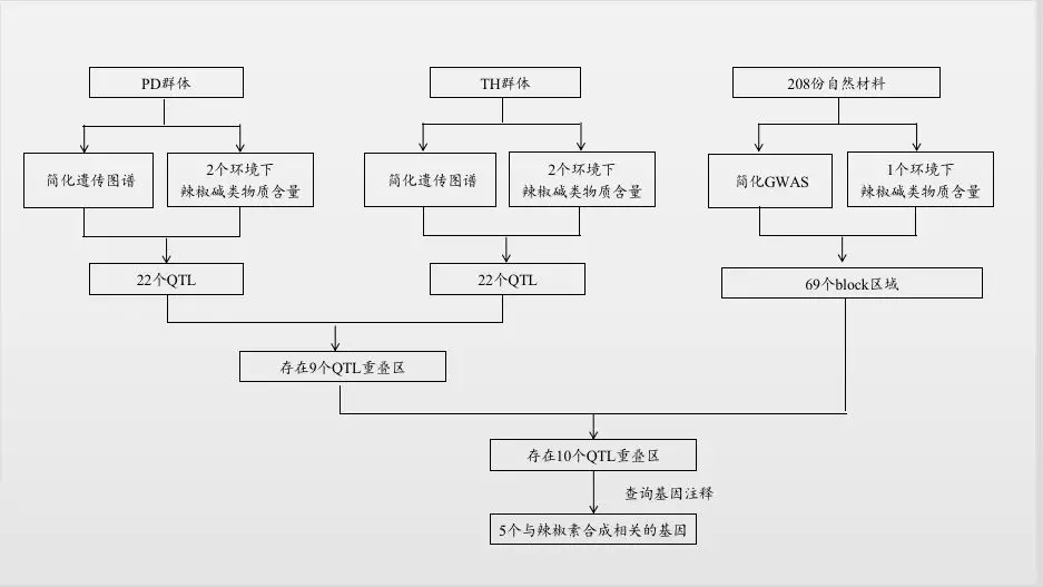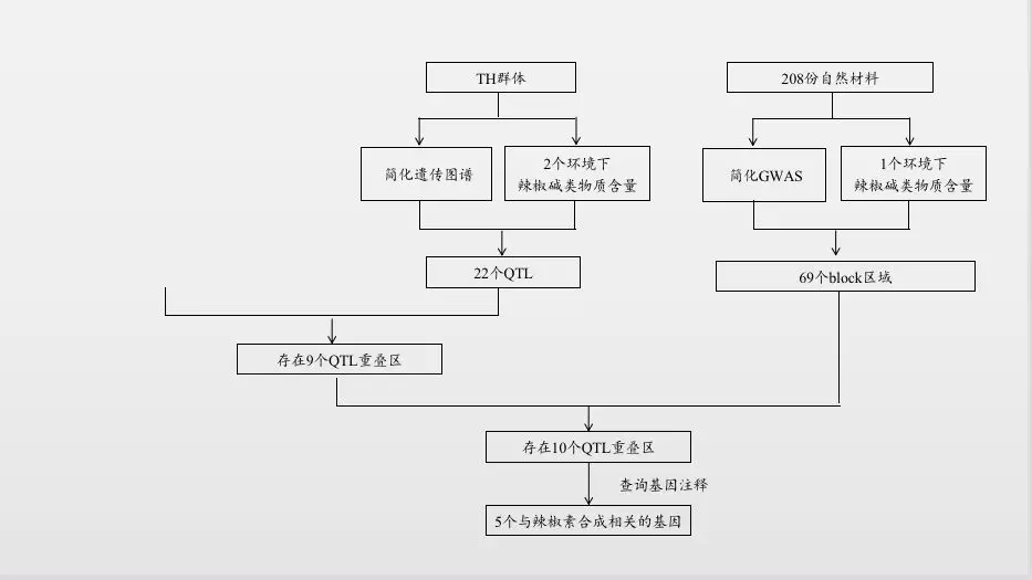 聯(lián)合分析結果:基于相同的參考基因組,通過(guò)比較QTL分析與GWAS分析的定位結果的物理位置發(fā)現GWAS結果中10個(gè)區域與本研究QTL定位結果重疊,查詢(xún)注釋結果,發(fā)現5個(gè)基因與辣椒素生物合成途徑相關(guān)基因。
