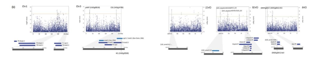 QTL定位結果:利用120個(gè)PD單株構建的重測序遺傳圖譜和3個(gè)環(huán)境下的56個(gè)單株表型數據定位到22個(gè)QTL位點(diǎn)。其中LOD值最高的是PD-dicap1.1 (LOD=8.7),表型變異率(R2)最高的是PD-dicap10.2 (28.8%)。同樣地,85個(gè)TH單株構建的簡(jiǎn)化圖譜和2個(gè)環(huán)境的表型數據定位到22個(gè)QTL位點(diǎn)。其中LOD值(LOD=9.9)和R2(18.8%)最高的都是TH-cap2.2。兩者分析時(shí)均用CM334作為參考基因組,因此可以對2個(gè)群體的QTL定位結果進(jìn)行比較,發(fā)現PD群體的9個(gè)QTL位點(diǎn)與TH群體的7個(gè)QTL位點(diǎn)的物理位置重疊。