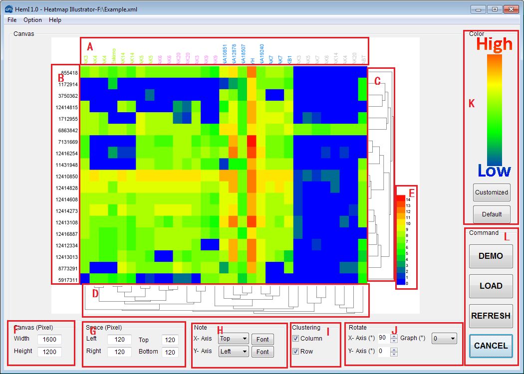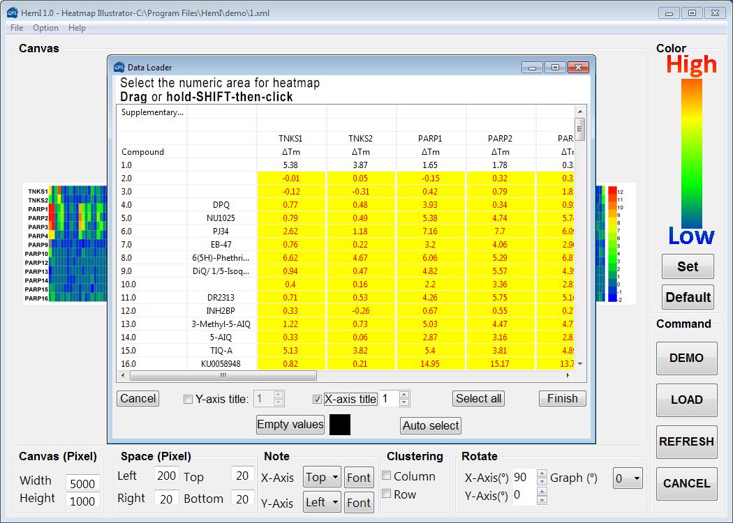 點(diǎn)擊L框中的LOAD按鈕即可打開(kāi)要生成heatmap的文件,excel格式也可以。X-axis title是選擇橫軸坐標對應到輸入文件的哪一行,選擇auto select自動(dòng)選擇矩陣數據。