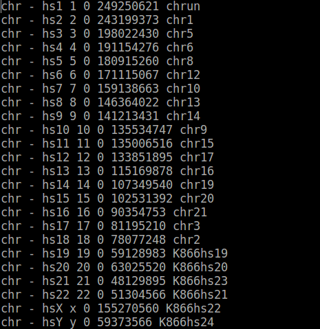 Circos圖可以展示數據在染色體上的分布情況,首先我們需要一個(gè)染色體的信息文件,畫(huà)出染色體的圈,該信息由circos.conf的karyotype參數進(jìn)行設置,如下圖: