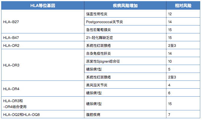 1972年Russel報告銀屑?。ㄅFぐ_)患者攜帶HLA-B13或HLA-B17。此后陸續發(fā)現大量其它疾病與特定的HLA相關(guān),其中,HLA-B27抗原見(jiàn)于大約90%的強直性脊椎炎病人,由此HLA-B27在臨床檢測中作為強直性脊柱炎的標志物,以至使HLA分型具有了診斷價(jià)值,甚至,能較早地證實(shí)疾病亞型之間的臨床區別,例如,尋常銀屑病與HLA相關(guān),而膿皰性銀屑病則不然;青少年性胰島素依賴(lài)型糖尿病與HLA-B8、HLA-Bw15和HLA-B18相關(guān),而晚期發(fā)作型糖尿病并無(wú)這種相關(guān)性。因此,特定類(lèi)型的HLA便成為某些疾病的遺傳標志。在疾病研究的延伸面,是關(guān)于HLA與長(cháng)壽的關(guān)系,目前亦形成一個(gè)新的研究熱點(diǎn)。目前研究比較清楚的幾個(gè)HLA與自身免疫疾病相關(guān)關(guān)系如下表: